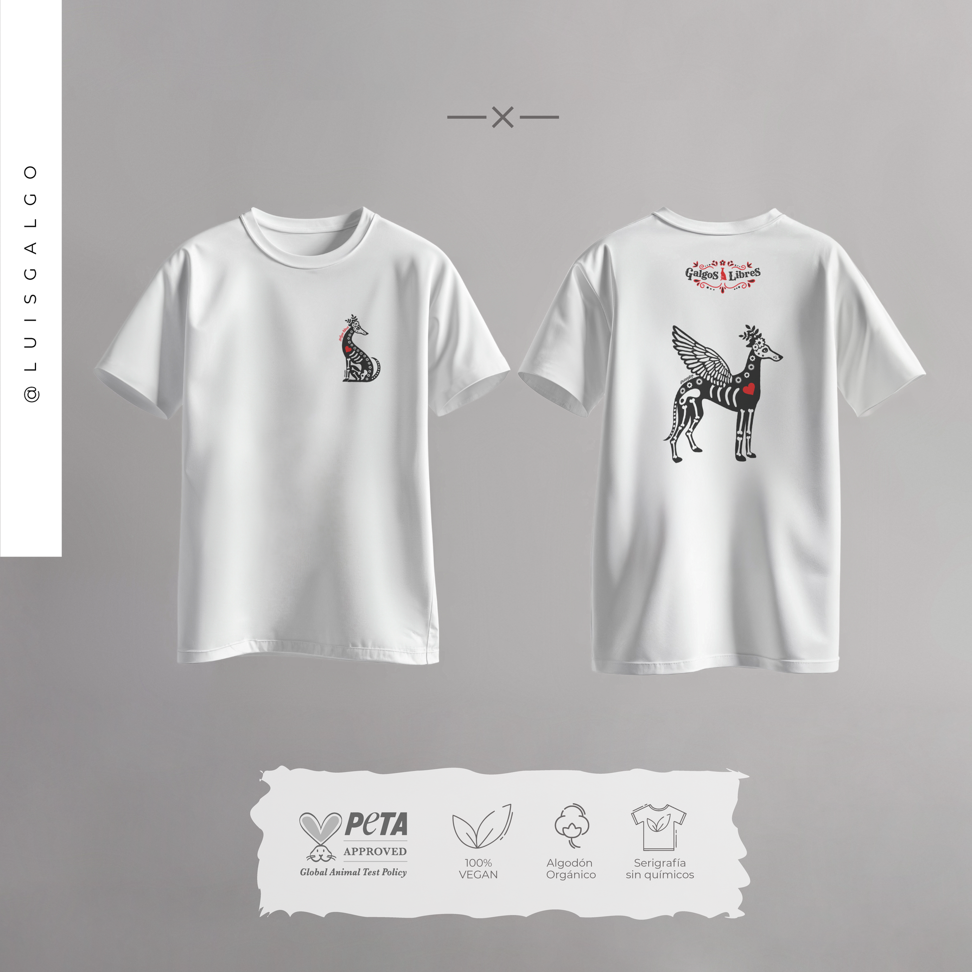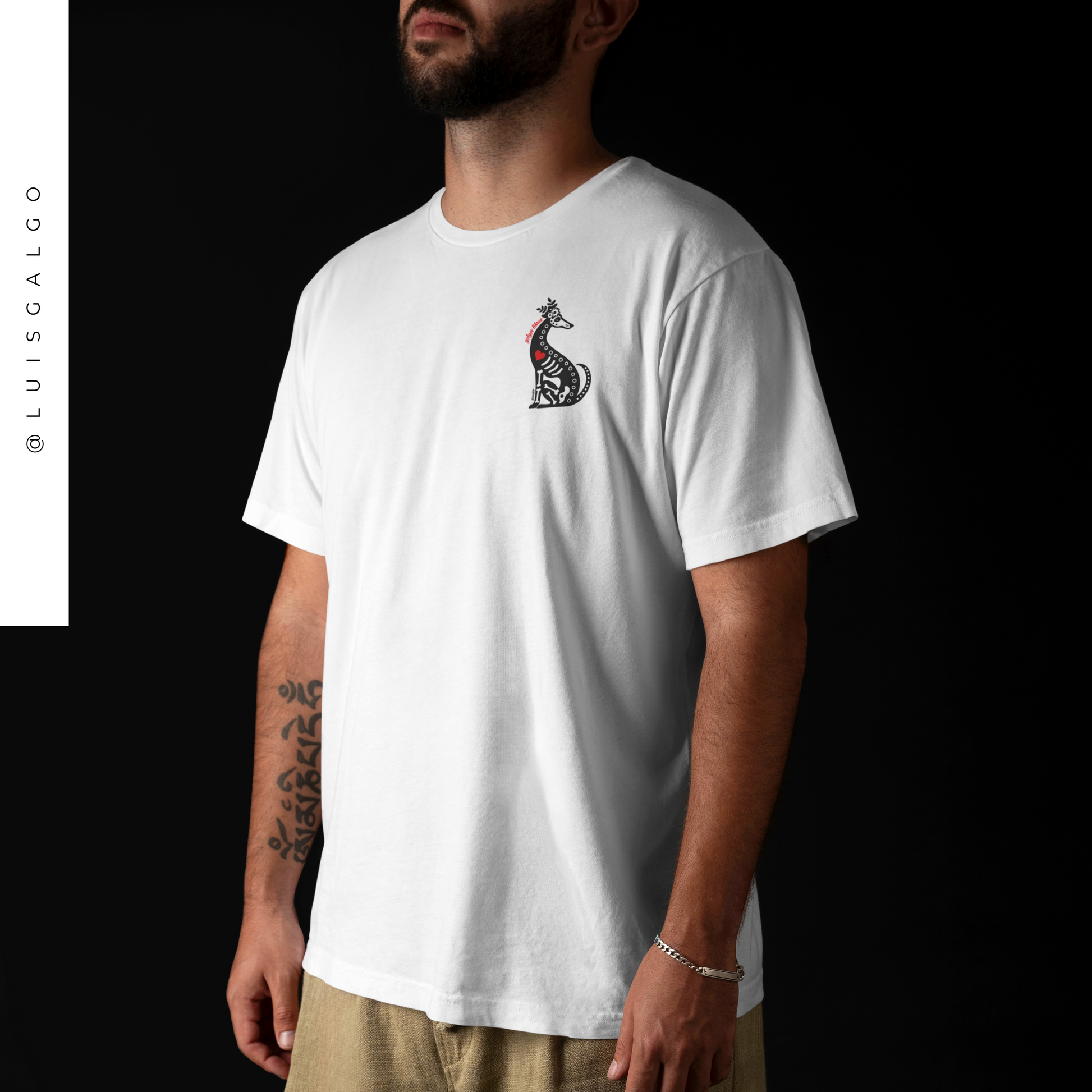 Inspirada en la magia y el misticismo de los alebrijes mexicanos, esta polera celebra el espíritu libre de los galgos rescatados. La ilustración de un galgo alado, decorado como un esqueleto festivo con corazón rojo, nos recuerda que incluso en la fragilidad hay fuerza, y que todo ser rescatado merece volar.