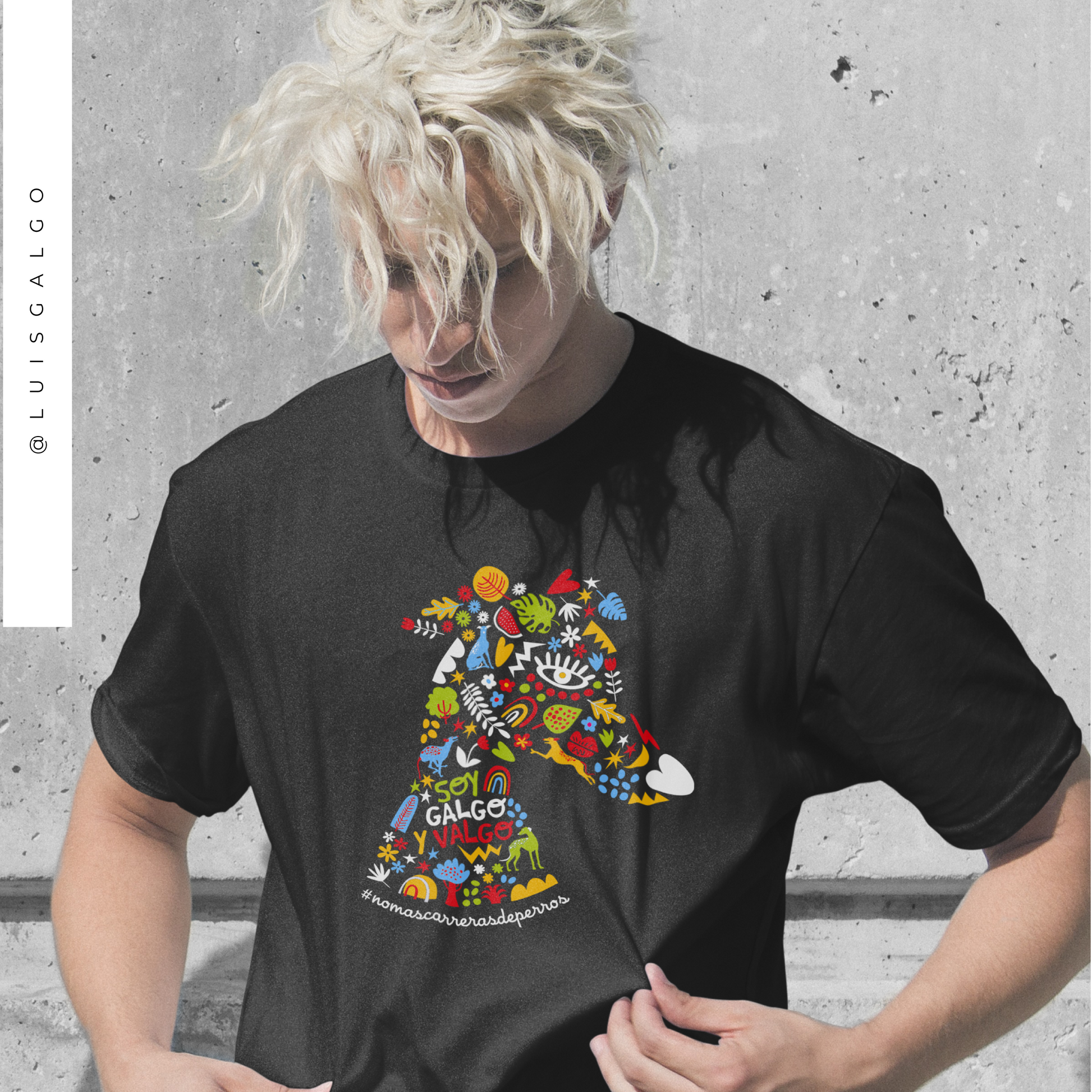 Esta polera es un grito de identidad y resistencia: “Soy galgo y valgo”, porque ningún ser vivo debería ser definido por su utilidad. El diseño está inspirado en el arte popular latinoamericano y da forma al perfil de un galgo compuesto por símbolos de vida, color y libertad. Un homenaje a todos los galgos que han sido usados, descartados y finalmente salvados.