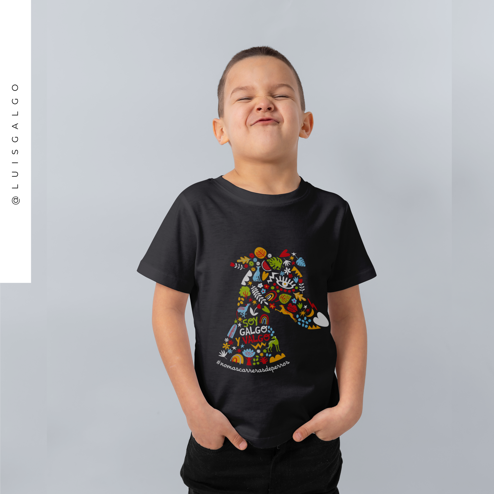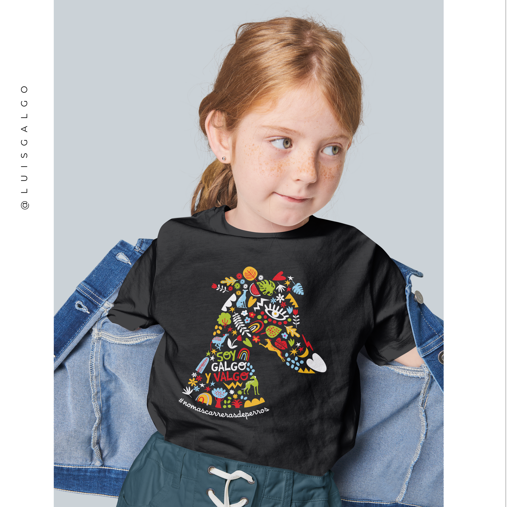 Esta polera es un grito de identidad y resistencia: “Soy galgo y valgo”, porque ningún ser vivo debería ser definido por su utilidad. El diseño está inspirado en el arte popular latinoamericano y da forma al perfil de un galgo compuesto por símbolos de vida, color y libertad. Un homenaje a todos los galgos que han sido usados, descartados y finalmente salvados.
